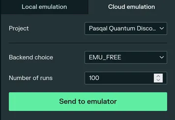 - Cloud: sending the experiment to one of Pasqal’s large-scale emulators.