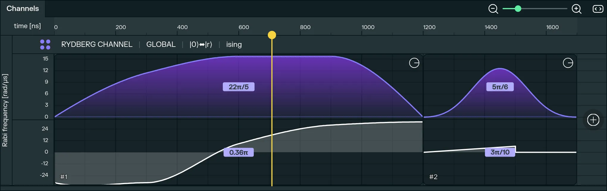During the execution of the experiment, laser pulses will be shown as gradual highlights on the register, symbolizing an analog computation mode where we are interacting with all the atoms at the same time (for global channels) or on specific atom targets (for local channels).